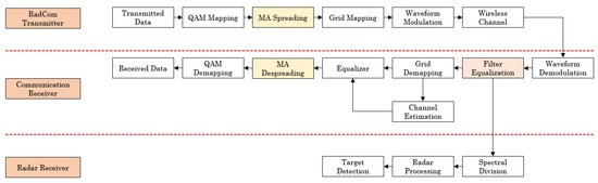 In recent years, multiple functions traditionally realized by hardware components have been replaced by digital-signal processing, making radar and wireless communication technologies more similar. A joint radar and communication system, referred to as a RadCom system, was proposed to overcome the drawbacks of the conventional existent radar techniques while using the same system for intervehicular communication. Consequently, this system enhances used spectral resources. Conventional orthogonal frequency division multiplexing (OFDM) was proposed as a RadCom waveform. However, due to OFDM’s multiple shortcomings, we propose universal filtered multicarrier (UFMC), a new 5G waveform candidate, as a RadCom waveform that offers a good trade-off between performance and complexity. In addition to that, we propose multicarrier code division multiple access (MC-CDMA) as a multiple-access (MA) technique that can offer great performance in terms of multiuser detection and power efficiency. Moreover, we study how UFMC filter length and MC-CDMA spreading sequences can impact overall performance on both radar and communication separately under a multipath channel. Analysis of the bit error rate (BER) of the UFMC waveform was performed in order to confirm the experiment results.