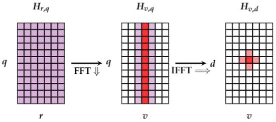 where describes the subcarrier spacing, denotes the additive white Gaussian noise of the q-th subcarrier for the r-th symbol; is the OFDM symbol length, where denotes Fast Fourier transform (FFT) length, and is CP length. Equation (8) shows that the delay (hence, range) can be estimated using inverse FFT (IFFT) over the frequency axis. The Doppler shift (hence, velocity) can be evaluated using FFT over the time axis. This is equivalent to applying a 2D periodogram, as depicted in Figure 3. The main advantage in this approach is that the delay and Doppler estimations are independent. At first, this operation estimates frequency and symbol indices, which should then be translated to distance and velocity through the following equations: