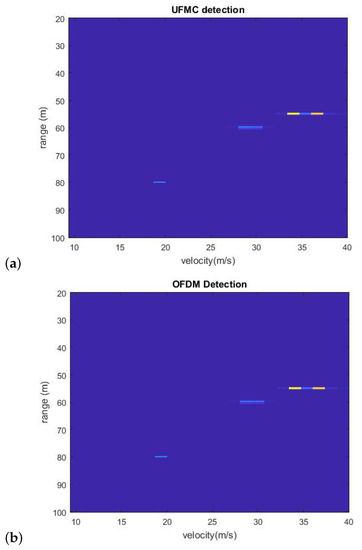 Figure 5 depicts the periodogram of the two received signals computed using the parameters in Table 1. Results confirmed that both suggested waveforms are suitable for radar, as we can clearly see the four targets on the distance–velocity grid. Furthermore, the UFMC waveform reduces the high OOB power emission while retaining the simplicity of the conventional OFDM signal. This also offers increased spectral efficiency due to the omission of CP.