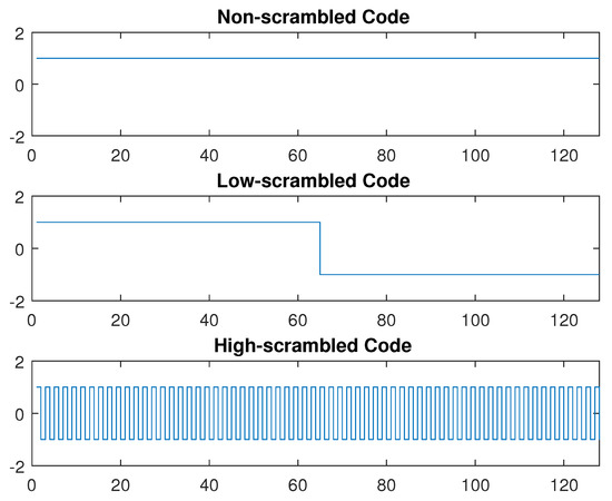 As depicted in Figure 6, we chose three Walsh–Hadamard codes with the same length, categorized as follows: a nonscrambled sequence, which is a sequence of ones, and usually the first generated sequence in the Hadamard matrix; the second code is more scrambled compared to the first and sequels 64 chips of the same binary codeword; the last sequence is the most scrambled sequence that could be generated. By choosing these three configurations, we implemented both worst- and best-case scenarios, and a third case to back up the overall results.