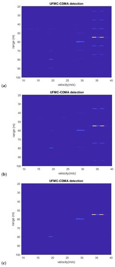 UFMC-code division multiple access (CDMA) radar performance with different spreading codes: (a) nonscrambled, (b) low-scrambled, and (c) high-scrambled codes.