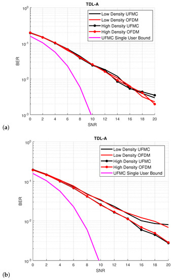 Uncoded bit error rate (BER) of UFMC vs OFDM under tapped delay line A (TDL-A) channel and maximal Doppler Shift: (a) maximal Doppler shift Hz; (b) maximal Doppler Shift Hz.