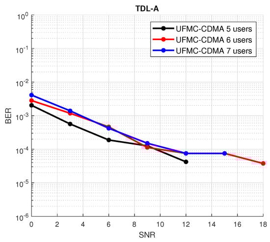 Regarding UFMC-CDMA, the TDL-A channel delays and patterns of interference between served users directly impacted the BER. System performance degraded as the number of users became larger, as shown in Figure 9. However, even for the long delays induced by channel and filter selectivity, UFMC-CDMA showed improved overall performance.