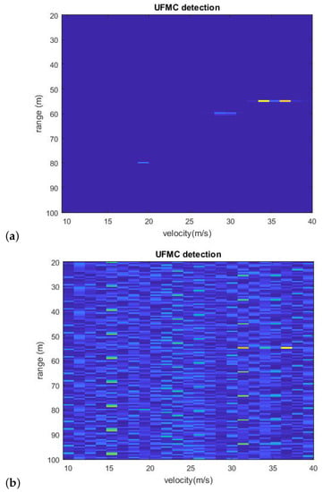 For targets, we chose to simulate 4 targets in which 2 targets shared the same distance and very close velocity to verify velocity resolution. Target 1 at a distance m with velocity m/s, Target 2 with m and m/s, Target 3 at a distance m distance m and m/s, and Target 4 with m and m/s. The UFMC parameters adopted in this case were sub-band size and filter length was 16 for optimal performance.