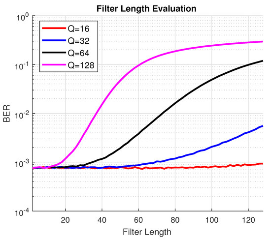 The BER versus filter-length curves for different sub-band sizes are presented in Figure 11. By increasing sub-band size and filter length, overall performance was degraded. For the case of , the BER was at dB for a filter length that ranged from 2 to 128. However, for , the BER began to rapidly degrade as soon as the filter length reached . For other sub-band cases, degradation was close to . Hence, optimal filter-length configuration L should be chosen to be smaller than for optimal performance.