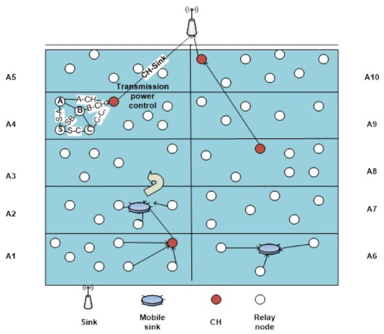In this paper, the sensor field is distributed into n sections, and relay nodes are arbitrarily positioned in the particular network area as shown in Figure 1. There is one fixed sink at the surface area and mobile sinks are positioned inside the sparse region. A ping message (control packet) is advertised by sink nodes across the network. This message has all the related facts of the sink node. Receiving nodes get the ping message from the fixed Sink and update its distance, when the routing path is setup, in the form of the number of hops from the sink fixed at the surface. Moreover, the receiving node sets a suitable Transmission Power Level (TPL) with the sink based upon the Received Signal Strength Indicator (RSSI). Along these lines, each node gets its distance from the sink, sets a suitable TPL, and then broadcasts this information in its transmission range. The same procedure is followed by other nodes. If a node receives a value greater than what it already has, it disposes of the ping message otherwise, it refreshes its distance information, sets a suitable TPL, and again broadcasts the ping message to nodes in its transmission range. This procedure proceeds till each sensor node sets a suitable TPL with the selected neighbors and obtains its distance from the sink. In short, control packets in the form of ping message contains a cost field which reflects the number of hops to reach the sink. In the setup phase, such control packets are propagated throughout the network. This results in establishing a minimum or shortest route from source to sink along with TPL adjustment of each node with its selected neighboring nodes. The parameters of simulation are shown in Table 1.