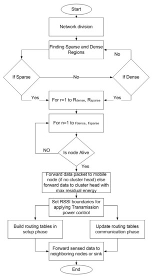 By gathering data packets at a nearby header node, this will help to mitigate interference. A composite data packet is sent by this node to the endpoint. Based on maximum residual power, CHs are chosen. CHs connect to both the sink node or with CH neighbors and the forward data packets, while handheld sinks are in dispersed areas to gather data with minimal energy consumption. If the RSSI reaches its predefined limit stated as either low or high, the sender node tunes its TPL accordingly, i.e., if the RSSI is below the limit, it switches to the next power level; on the other hand, if the RSSI is above the high limit, the power level will degrade to a level. The RSSI limits are fixed at the start of the data communication phase and it depends on the channel condition. The process of the proposed technique is depicted in Figure 3, where n is the number of nodes, R is the region, r is the rGR which is donated searching the number of sparsity and density regions of the network.