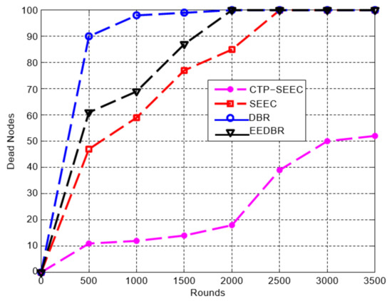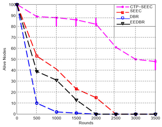 After introducing the managed transmission power function in SEEC, as seen in Figure 4, the network lifetime is enhanced. In SEEC, each sensor node was transmitting packets at a predefined transmission power which made the network die prematurely. In the controlled transmission power (CTP) strategy, transmission power is adjusted by the source node based on Euclidean distance to the destination node. These adjustments of power vary energy consumption for each time when the packet is sent. This variation in energy consumption increases the network lifetime. In Figure 4, it can be seen that the nodes in SEEC with CTP are alive at round 3500 whereas the SEEC without CTP is dead at round 2500 as shown in Figure 5. In DBR During the information sending, the sender incorporates its depth; the data packets accepting nodes contrast their depths with the sender node. The node with a small depth advances the packet to the sink. For each data packet, each node has a fixed holding time, so nodes with greater depths have a smaller holding time. Therefore, because only the depth of the sensor node is used for propagation, these nodes die before alternative nodes that lead to energy holes; see Figure 5. The nodes in DBR with CTP are alive at round 3500, whereas the DBR without CTP is dead at round 2000, as seen in Figure 4.
