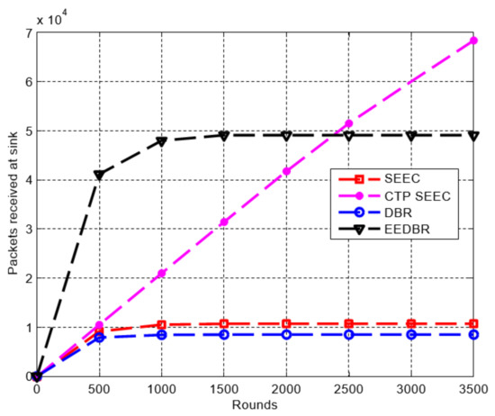 Figure 12 shows that the received packets at the sinks in CTP-SEEC are higher than other protocols, which results in high throughput and a more reliable network.