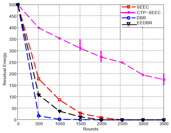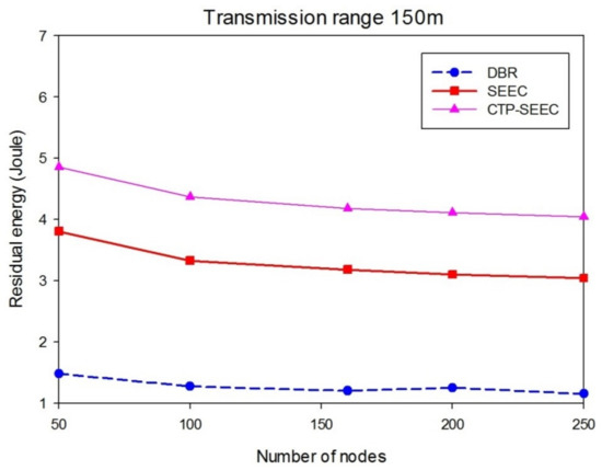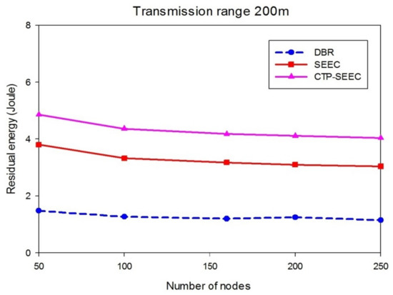 Figure 9 shows the higher energy consumption in CTP-SEEC, SEEC, and DBR, when decreasing the transmission range. In CTP-SEEC, the residual energy within a 200 m transmission range is more than a 150 m transmission range. The cluster heads collect the data of all the cluster members and then forward these to the cluster relay which belongs to another cluster.
