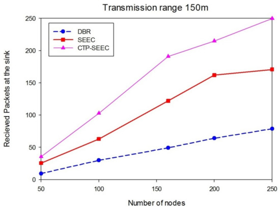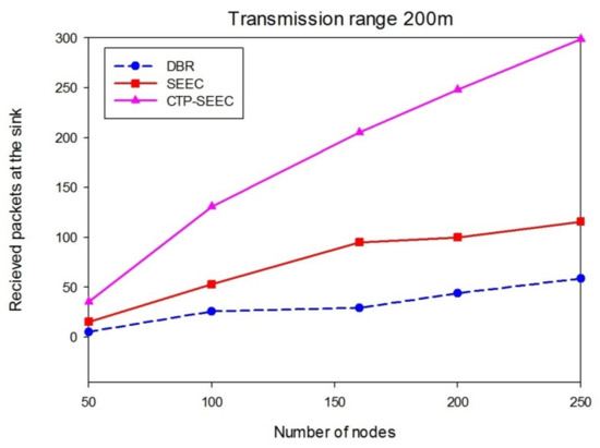 In Figure 11, we can see that by changing the transmission range to 200 m, the received packets at the sink increases in CTP-SEEC protocol, which is higher than in SEEC, or DBR. It increases the received packets at the sink with increase to the transmission range and it is periodically different from the total number of received packets in CTP-SEEC.