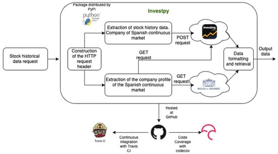 Figure 3, shows the Python package that has been created for data extraction from Investing.com (after prior authorisation from the company on 28 January 2019). It supports different versions and has been loaded into PyPI (Python Package Indexer). The second significant aspect is continuous integration. The package is monitored, also, unit tests and code coverage are checked (this functionality determines the number of lines of code, identifying unusable lines of code) through Travis CI. In addition, the developed Python package supports more banking products such as funds or ETFs (Exchange Traded Funds), enabling the future implementation of additional functionalities in the platform.
