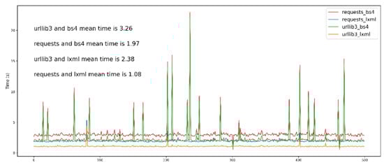 Figure 4 shows the graphic representation of the combination of possible Python package times for each of the different phases that are involved in Web Scraping. The combinations are shown in best to worst scaling, as follows: request-lxml, request-bs4, urllib3-lxml and urllib3-bs4. Therefore, to send the request to Investing.com and extract the HTML, either GET or POST type requests are optimal, while lxml is optimal for historical data extraction and parsing.