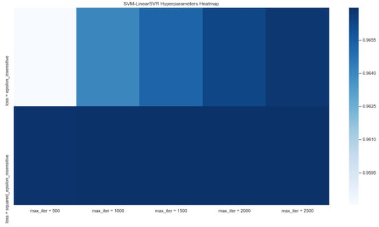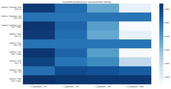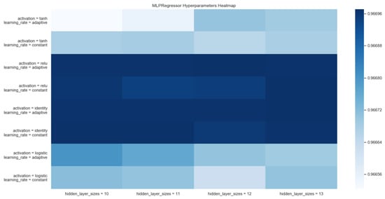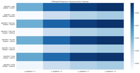 Figure 9, Figure 10, Figure 11, Figure 12 and Figure 13 present the heat maps resulting from the cross-validation of BBVA’s historical data from the last five years. These figures represent the accuracy of the model with each combination of hyperparameters for the algorithms: MLPRegressor, SVMLinearSVR, RandomForestRegressor, GradientBoostingRegressor, and KNNNeighborsRegressor.