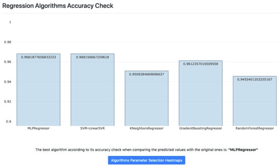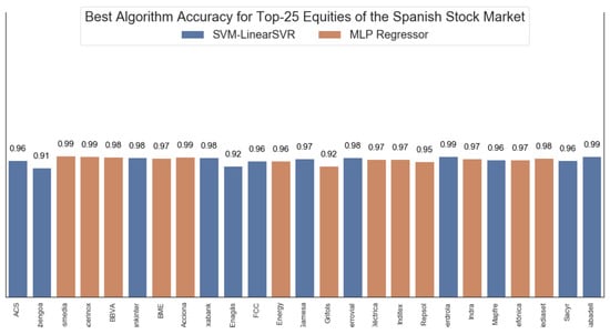 Once the evaluation process and the cross-validation of the algorithms have been completed, a graph showing the best algorithm has been drawn up. The top-25 equities of the Spanish Continuous Stock Market have been chosen. Figure 14 shows that the algorithms that best fit the proposed problem are SVM-LinearSVR and MLP Regressor. Thus, these algorithms are the ones that have the highest accuracy after being trained and tested with an 80/20 split of the dataset.