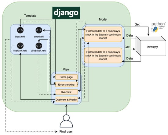 The result is a platform that provides a user interface for both data visualization, analysis, prediction, and investment recommendation. It has been determined that the platform will be developed using Django, as shown in Figure 15. Django is a Python framework for creating web services, in this case it has been used to communicate the back-end with the front-end. The web application created combines the use of Python for data management and communication, and HTML, CSS, and JavaScript for the visualization of both the platform and the data.