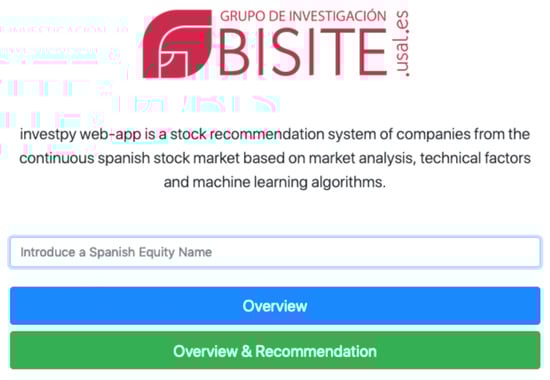 The platform’s objective is not only to be usable and intuitive, but also to enable any user, whether an expert or not in the stock market, to abstract their own conclusions from the data and evaluate the information analyzed by the system. The created platform completely depends on the Python package developed for data extraction: investpy. The web platform initially shows a screen where the overview option is given on one side and the overview and recommendation option on the other (Figure 16). The overview functionality covers the extraction and basic visualization of the data. The system retrieves the company profile and the historical data for the last five years of the stock. On the basis of those data, it produces a series of representations: