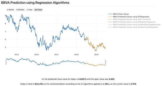 Once the justification of the regression algorithms used in the platform by the system has been shown, the results of the different algorithms applied are displayed, where the “best” algorithm (the one with better precision than the rest) is the one that shows its results by default (Figure 18). Even so, the platform gives the option of displaying different time windows and visualising the results of all the algorithms. Finally, the platform displays a paragraph, in which it indicates the conclusions drawn from the study of the values resulting from the prediction and, therefore, shows the buy/sell recommendation based on these values.