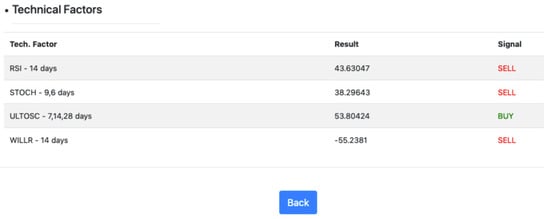 Therefore, the platform displays the recommendations based on the results of the prediction, which it will combine with the results of the financial technical analysis, which includes the calculation of moving averages and technical factors. Finally, the system calculates the technical factors, called Momentum Indicators, which indicate the market trend based on calculations taking different time windows (Figure 19).