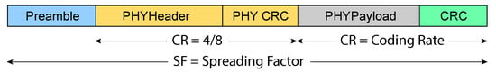 Two frame formats are supported by LoRa []. In the explicit frame format shown in Figure 3, a header frame is used, which holds information about the payload length, CR being used, and information on whether an optional Cyclic Redundancy Check (CRC) payload is used. In the implicit frame format, only the payload is used. In both formats, the preamble is used for receiver synchronization. Preamble length can go from 6 to 65,535 symbols. Preamble is combined with an additional 4.25 symbols added by LoRa modem, which results in a synchronization word. For example, the preamble length in LoRaWAN is six symbols. The preamble is followed by a header part of the packet with a coding rate set to 4/8, which is followed by a payload with size ranging from 1 to 255 bytes.