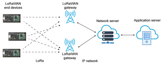 LoRaWAN uses a star network topology (Figure 4) in which there are three main participants, namely LoRa modules (End Nodes), which can be designed for a variety of applications; one (or more) LoRa gateways; and a central network server. The gateway forwards packets received between the LoRa module and the central network server. LoRaWAN network protocol is used to send packets between modules and gateways, while traffic between the gateway and the central server is established via some fast network technologies such as WiFi, Ethernet, 4G, and 5G. The central server further transmits the received packets to the application server, which then processes them for further application usages.