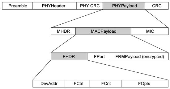 The structure of the LoRaWAN packet is defined by the LoRaWAN specification and is shown in Figure 5. Transmission of LoRa packets is initiated by a preamble, which is followed by the radio layer along with a MAC layer of a packet.