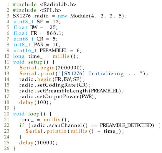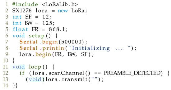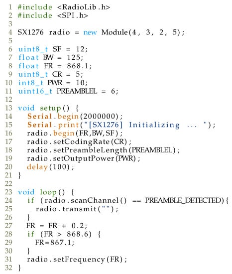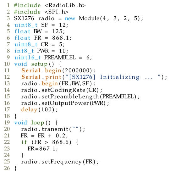 For the attack implementation, RadioLib (https://github.com/jgromes/RadioLib, accessed on 28 January 2021) library was utilized, and the code is depicted in Figure 12.
