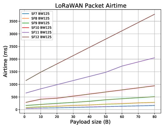 LoRaWAN (Long Range Wide Area Network) packet airtime for different SF (Spreading Factor) with payload size varying from 1 to 80 bytes. Standard payload overhead of 13 bytes was not included in payload size.