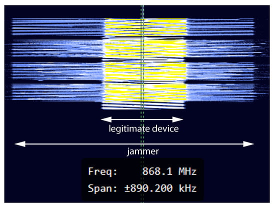 Example of a jammer interfering with transmission of legitimate packet at 868.1 MHz, captured with HackRF One.