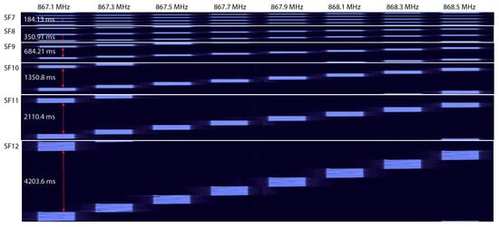 LoRa utilizes Chirp Spread Spectrum (CSS) modulation [] for message transmission from the end node to the gateway (and otherwise). CSS is a modulation process in which information is modulated by frequency chirps (frequency rise/decrease over a period of time). The use of CSS modulation increases the robustness of the LoRa network and the signal resistance to interference. CSS is a spread spectrum technique in which the signal is divided into different frequency domains. An example of LoRa-based signal modulated with CSS technique can be found in Figure 2.