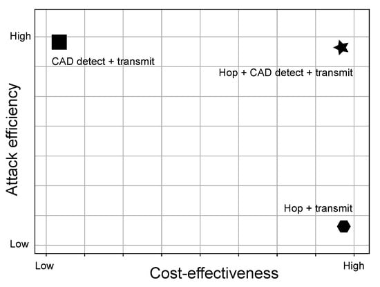 In Figure 15, different jamming strategies are compared using LoRa-enabled devices with respect to their impact on both cost-effectiveness and efficiency of the attack. Clearly, strategy 3-Reactive Jammer with Channel Hopping, CAD detection and transmission-appears within the upper right corner. The proposed strategy has very good jamming success rate accuracy, but it also cost-efficient, as described further below. The first strategy, which achieves the best accuracy, is costly as it requires a single LoRa radio modem per combination of frequency channel, spreading factor and bandwidth, making it quite expensive for implementation. Hence, it appears in the upper left corner in Figure 15. The price to achieve the attack with the second strategy is equal to the price of the third strategy, however, its accuracy is very small.