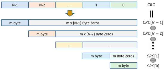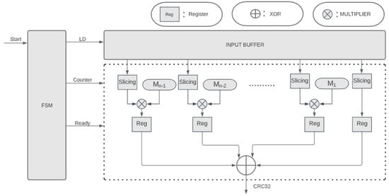 - Derby, J. High-speed CRC computation using state-space transformations. In Proceedings of the GLOBECOM’01. IEEE Global Telecommunications Conference (Cat. No.01CH37270), San Antonio, TX, USA, 25–29 November 2001; pp. 166–170. [Google Scholar] [CrossRef]