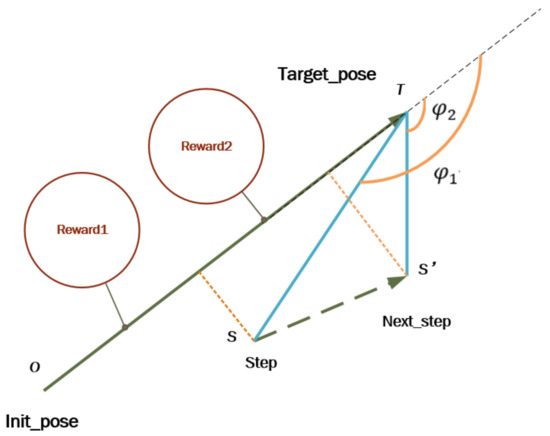 where is a positive constant. In the coordinate system of the base of the manipulator, the azimuth reward function was formed by comparing the angle and distance of the current position with the target position. The azimuth reward function was given as: