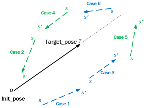 The movement process of the manipulator’s end-effector from the initial position to the target position is classified into six cases. As shown in Figure 2, through the analysis of the six cases, the six cases are divided into two categories: the proximity to get positive reward and the distance to get negative reward.