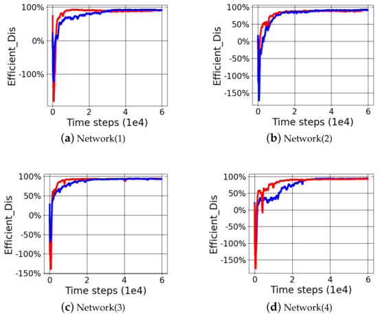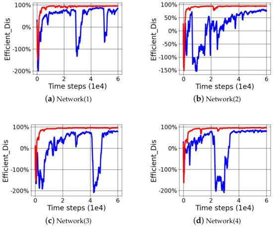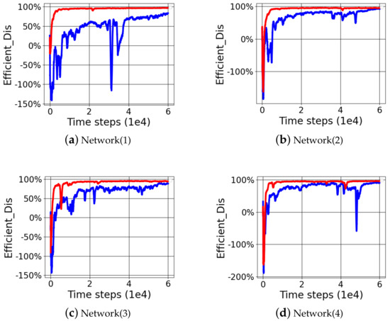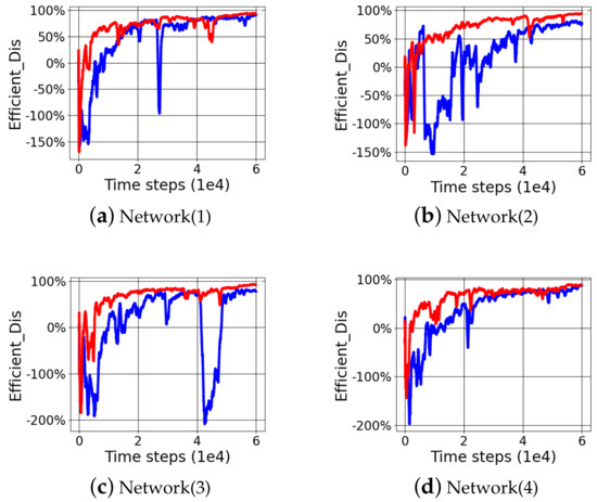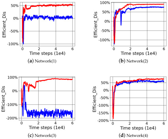 Under the reward function (2), the efficient distances between RTD3 (red) and TD3 (blue) for four times of randomly initialized network node parameters under the same initial network node conditions as shown above in (a–d).