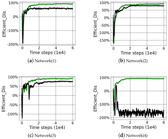 The efficient distances between reward function(3) (black) and reward function(4) (green) for four times of randomly initialized network node parameters as shown above in (a–d).