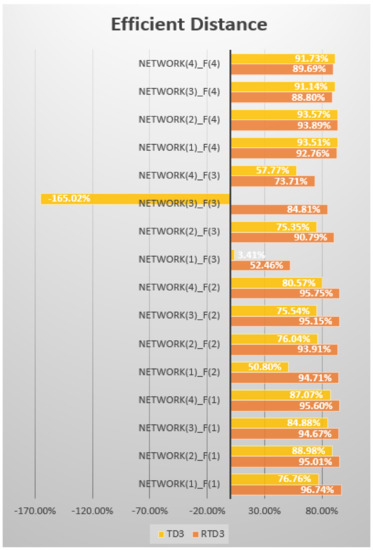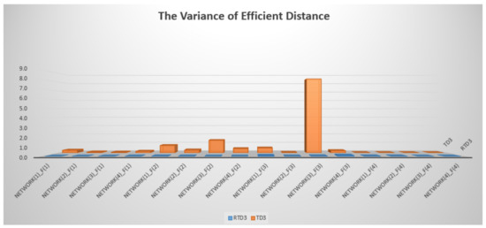 By comparing the variances, we can see that RTD3 was better in learning ability and better in robustness in learning process in Table 9 and Figure 12. Compared with the TD3 network structure, the average efficient distance variance of RTD3 was 0.0171, while that of TD3 was 0.7988, which was 46.71 times that of RTD3. When wiping out the controversial Network(3)_F(3) comparative experimental data, the average efficient distance variance of RTD3 was 0.0165, that of TD3 was 0.2956, which was 17.94 times that of RTD3. In some comparative experiments, the variance of efficient distance of RTD3 was even hundreds of times better than that of TD3. It also showed that RTD3 network structure could show better stability in the middle and late learning stages of multi-DOF manipulator learning.