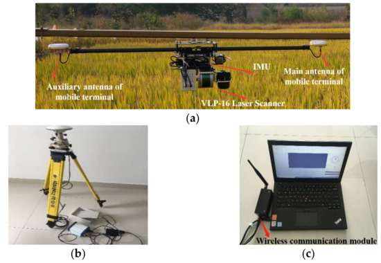 The LiDAR measurement system, including a mobile measurement terminal (Figure 1a), base station (Figure 1b) and computer control terminal (Figure 1c), was established to acquire point-cloud data. The mobile measurement terminal was equipped with a laser scanner (VLP-16, Velodyne, San Jose, CA, USA) and integrated navigation module (SPAN-IGM-A1, NovAtel, Beijing, China). The main parameters are shown in Table 1.