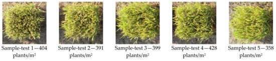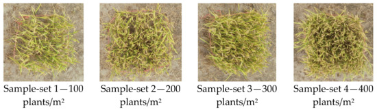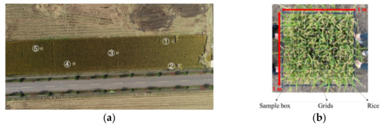 The size of sampling frame is 1 m × 1 m, divided into 100 grids, through soft rope, as shown in Figure 4b. Thus the required density of each sample could be defined conveniently by setting the corresponding number of rice plant in each grid area. For instance, when the required density was 100 plants/m2, only one rice plant was kept in each grid area, and then the surplus rice plants in each grid area were manually removed.