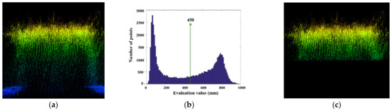 Matlab software (MathWorks, Natick, MA, USA) is used to program the selection of elevation threshold, as shown in Figure 5. Threshold value of the point-cloud data based on the elevation distribution histogram is 450, located between maximum peak and minimum peak. The panicle-segmentation result based on the elevation threshold is shown in Figure 5c.