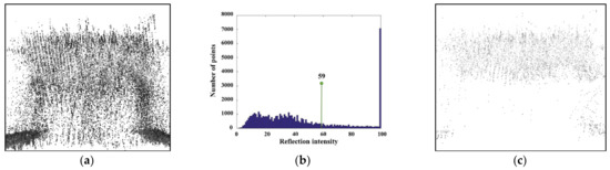 Point-cloud data segmentation by intensity inflection threshold: (a) reflection intensity value of point-cloud data, (b) histogram of reflection intensity distribution and (c) segmentation based on reflection intensity distribution.