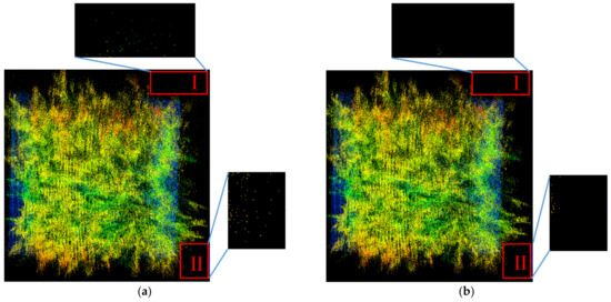 Data were acquired for the random experiment group. As an example of noise reduction, the result of Sample-test 2 is shown in Figure 9. It can be clearly seen that the noise points in areas Ⅰ and Ⅱ are obviously reduced. As indicated in the previous section, the 3D cloud point of the panicle is difficult to segment accurately. Figure 10 shows the results of double-threshold segmentation based on elevation and reflection intensity. The precise point cloud of each sample in random experiment group could be obtained, so that the further crop estimation could be more accurate.