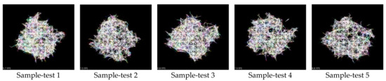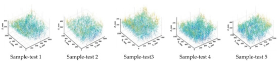 The rice-density-estimation results for random experiment group are shown in Table 5. Each sample was measured three times, so that it was calculated by both estimation methods trice. The result pictures obtained from supervoxel clustering are shown in Figure 11, and the result pictures from mean-shift clustering are shown in Figure 12.