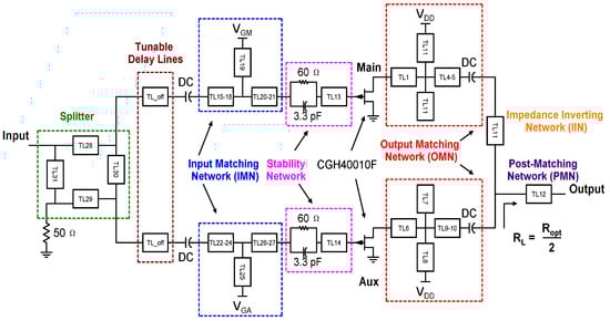 The schematic of the proposed DPA is illustrated in Figure 1, highlighting its building blocks. The DPA consists of main and auxiliary amplifiers, both based on the same active device biased in class AB and C, respectively. When the input power is low, the main amplifier is ON, and the auxiliary amplifier is OFF. Increasing the input power, the main amplifier reaches its maximum output voltage, and the first peak of efficiency occurs. At that point (break point), the auxiliary amplifier turns on and modulates the load of the main amplifier by injecting current at the common node. In this way, the output voltage and efficiency of the main amplifier remain, in principle, at the maximum value, while the output current and hence output power increase. The theoretical drain efficiency of the DPA is given by: