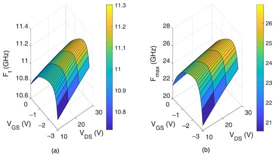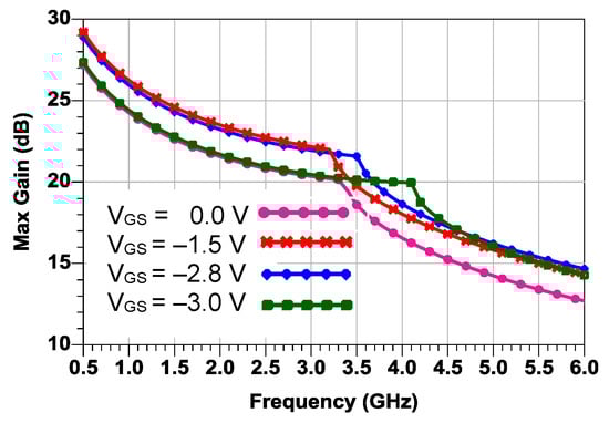 The CGH40010F GaN HEMT from Wolfspeed (Wolfspeed, Durham, NC, USA) was adopted to design the DPA. The Maximum Available Gain (MAG) of this device for different bias voltages is shown in Figure 2. As shown in Figure 3, the maximum frequency (around 26 GHz) and cut-off frequency (around 11.3 GHz) are only slightly dependent on the bias voltages, and ; thus, they do not represent a limit for the bias selection. The drain voltage was set to 28 V, which was compatible with the maximum frequency and voltage swing.