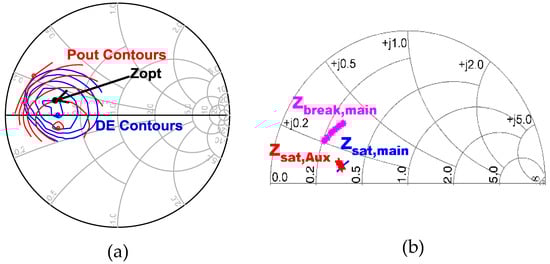 (a) Load-pull contours for the drain efficiency (blue) and output power (red) at 3.3 GHz and (b) optimum output impedance at saturation and Output power Back-Off (OBO). DE, Drain Efficiency.