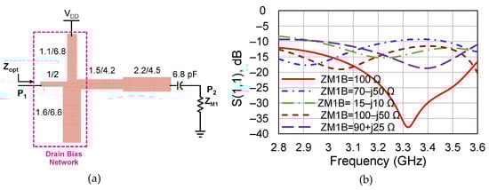 (a) Output matching network of the main (dimensions (width/length) are in mm) and (b) input reflection coefficient when port 1 is normalized with respect to for different load impedance at the break point.