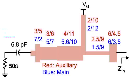 Once having set the OMN, the Input Matching Network (IMN) can be designed. The proper design of the IMN is crucial to maintain high efficiency and equalize gain over wide bandwidths. Source-pull analysis was therefore performed to find the optimum input impedances for the main and auxiliary, which were (considering again a mean value over the entire bandwidth) (5 + j30) and (3.2 + j18.5) , respectively, and were then matched to 50 . The final layout of the input matching network is illustrated in Figure 7. As can be noted, also for the IMN, the stepped impedance approach was followed. The topology for both IMNs was the same; however, the values of the transmission lines were independently optimized to account for the different biasing class. A parallel RC network (R = 60 and C = pF) was inserted in series with the gate to ensure in-band stability with the lowest possible associated losses.