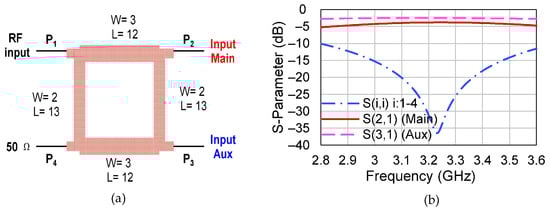 Finally, an uneven hybrid (branch line) splitter was designed with a 50 reference impedance at all ports to provide the necessary splitting of the input signal into the main and auxiliary paths with a phase shift between them. The power splitting ratio was . Figure 8 shows the layout and the simulated behavior of the splitter. Return loss was below −10 dB over the entire band. The isolated port was connectorized to allow for the insertion of an external resistor with high power handling capabilities.