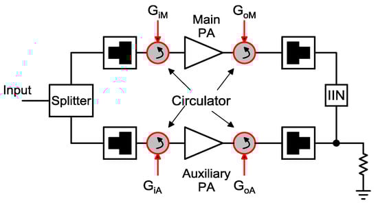 - Sun, G.; Jansen, R.H. Broadband Doherty power amplifier via real frequency technique. IEEE Trans. Microw. Theory Tech. 2011, 60, 99–111. [Google Scholar] [CrossRef]